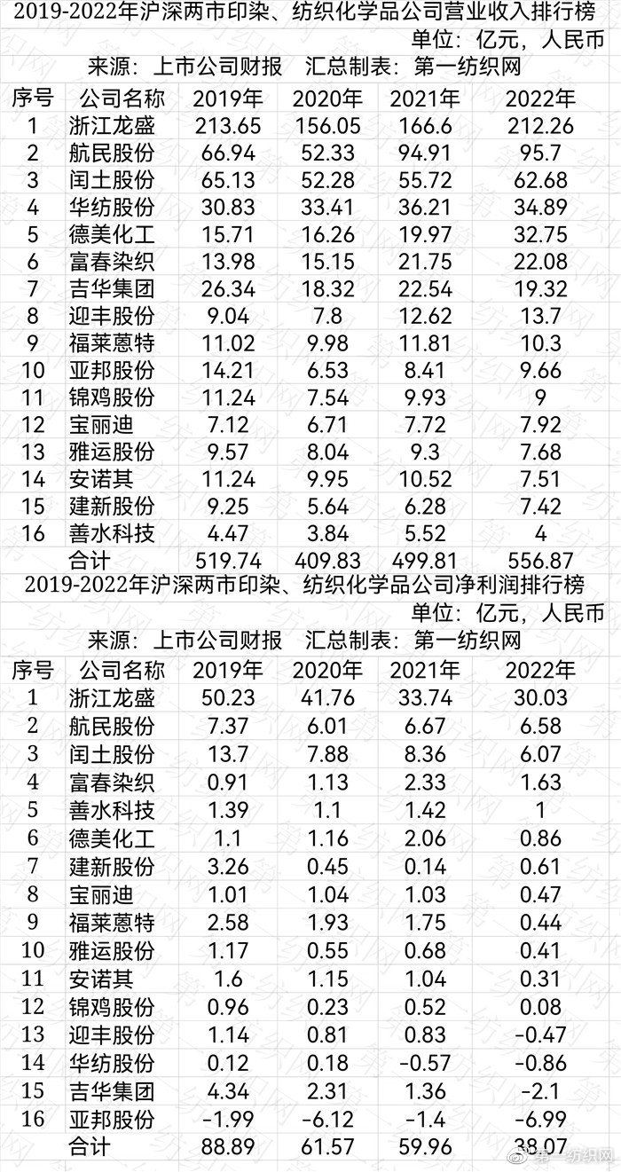 据第一纺织网监测统计,2022年,沪深两市印染、纺织化学品16家上市公司合计实现营业收入556.87亿元,合计归属于母公司所有人的净利润38.07亿元,虽然浙江龙盛含有地产业务,航民股份涉及黄金领域,但依然和闰土股份、富春染织和善水科技分居营业收入前五;净利润方面,依然由浙江龙盛、航民股份、闰土股份、富春染织和善水科技领先。