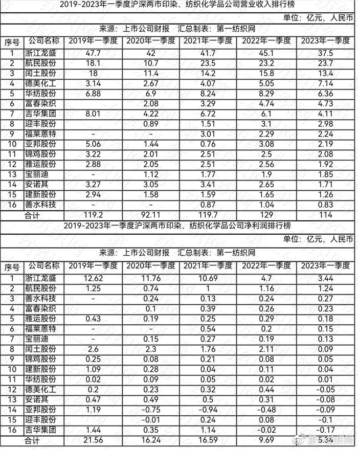 2023年一季度,沪深两市印染、纺织化学品16家上市公司合计实现营业收入114亿元,合计归属于母公司所有人的净利润5.34亿元。从营业收入来看,浙江龙盛、航民股份、闰土股份稳居前三,德美化工和华纺股份则屈居第四和第五名;净利润方面,善水科技进入前三,富春染织和雅运股份则占据第四和第五名。