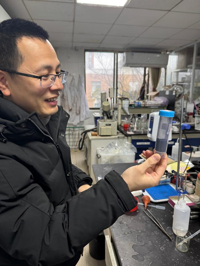 江华在实验室里展示卡宾染料成品