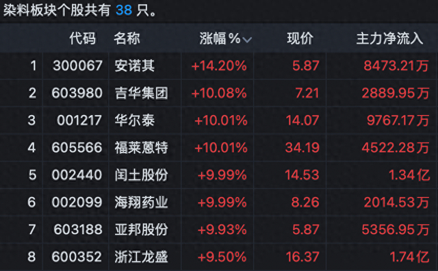 染料行业的涨价热潮也直接反映在资本市场。2月9日,A股染料板块集体走强,多只个股实现涨停,其中福莱蒽特、闰土股份、吉华集团、亚邦股份等先后封板,安诺其涨幅更是高达14.2%,板块整体表现亮眼。